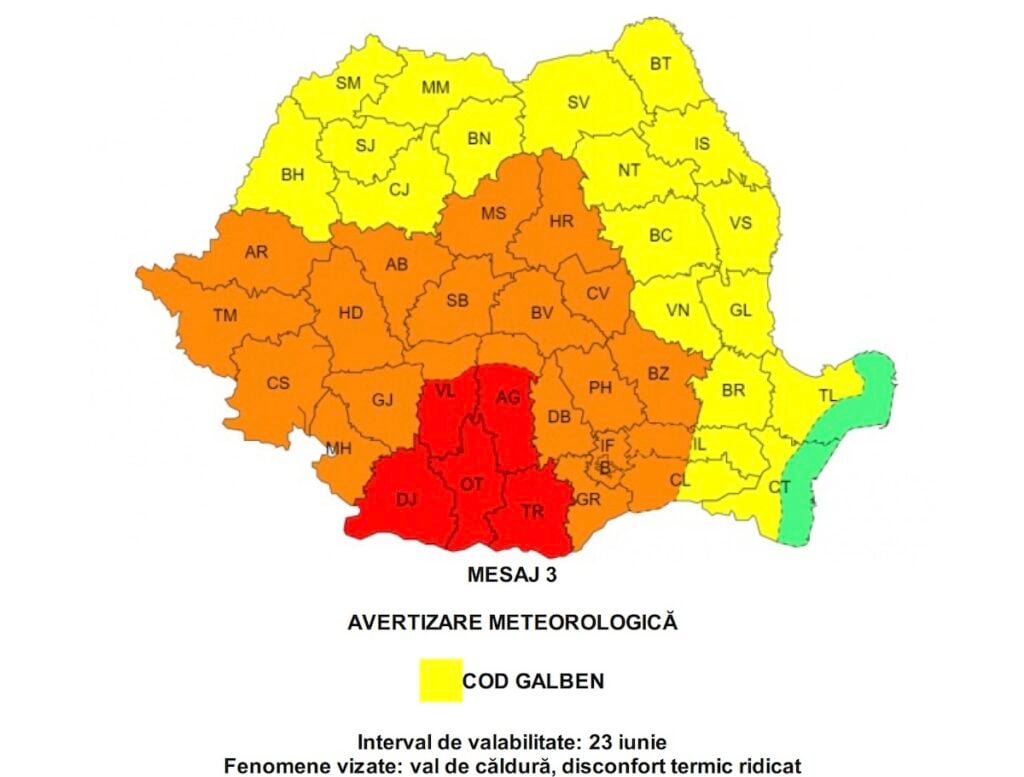 Cod galben și apoi portocaliu de caniculă. Nopțile vor fi tropicaleMeteorologii au emis miercuri un cod galben de caniculă valabil pentru întreg județul Sibiu. Temperaturile cresc joi, iar pentru această zi specialiștii transmit o avertizare de cod portocaliu. Astfel, miercuri valul de căldură va continua să se extindă și să -
