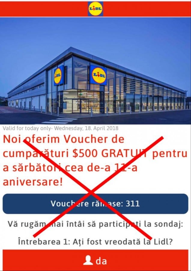 Înșelătorie pe Whatsapp cu vouchere de cumpărături la magazinele Lidl și CarrefourCentrul Național de Răspuns la Incidente de Securitate Națională (CERT-RO) avertizează asupra unei înșelătorii care vizează clienții Lidl Romania și Carrefour Romania, prin metoda oferirii unor vouchere de cumpărături, care funcționează exclusiv pe mobil și se propagă rapid, prin intermediul -