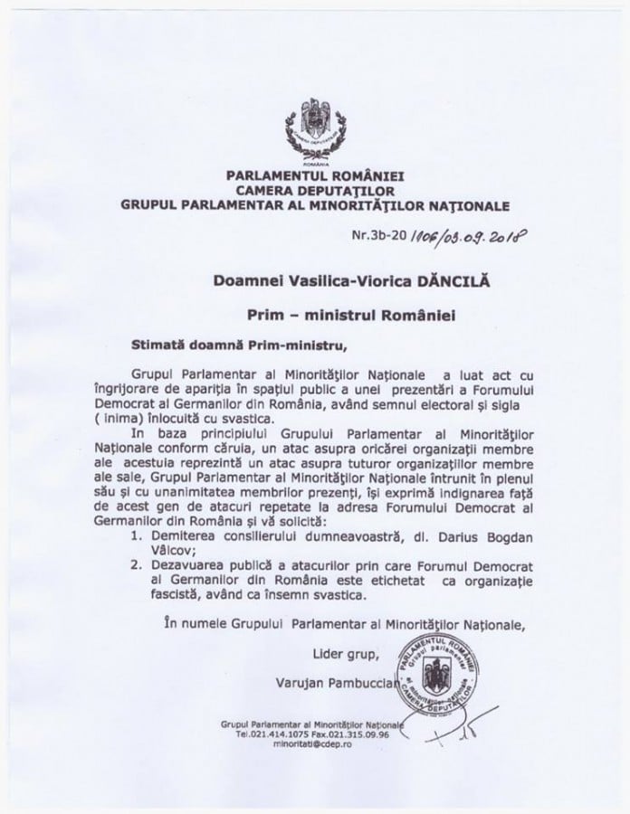 Grupul parlamentar al minorităţilor naţionale îi cere premierului demiterea lui Darius VâlcovGrupul parlamentar al minorităţilor naţionale i-a cerut, printr-o scrisoare, premierului Viorica Dăncilă demiterea consilierului Darius Vâlcov, pentru postarea în care acesta asocia însemnele Forumului Democrat al Germanilor cu svastica. „Grupul Parlamentar al Minorităţilor Naţionale a luat act cu îngrijorare de -