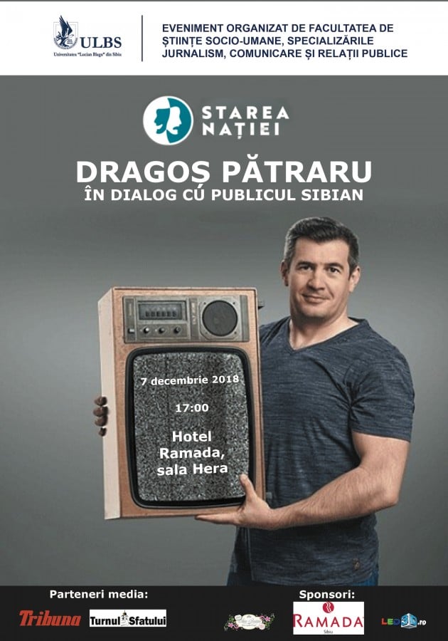 Discuție despre starea nației. Românești. La Sibiu. Cu Dragoș PătraruSibienii sunt invitați la finele acestei săptămâni o discuție liberă cu Dragoș Pătraru, realizatorul emisiunii “Starea nației“, pe diferite teme legate de realitățile cotidiene. Întâlnirea cu jurnalistul Dragoș Pătraru – realizator al cunoscutei emisiuni de peste 15 ani – este -