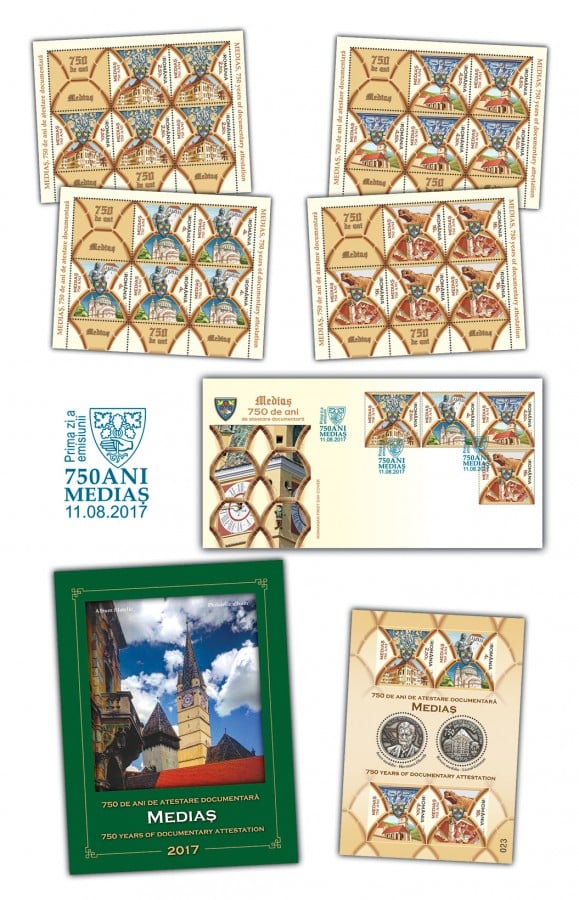 Timbru pentru Mediaș.  750 de ani de atestare documentarăDe vineri se va introduce în circulație emisiunea aniversară „Mediaș, 750 de ani de atestare documentară“. Cele patru mărci poștale ale emisiunii, cu valoare de 2.5, 4, 4.5 și 16 lei, precum și albumul filatelic special prezintă, într-o manieră originală, orașul considerat -