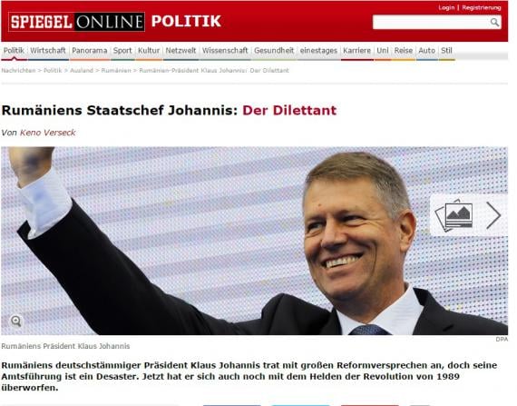 Der Spiegel despre Iohannis: “Diletantul”Președintele Klaus Iohannis face obiectul celui mai critic articol apărut în presa germană, după instalarea sa la Cotroceni. Un jurnalist de origine maghiară, fost corespondent în Ungaria și România, scrie în revista germană că președintele României, membru al minorității germane, -