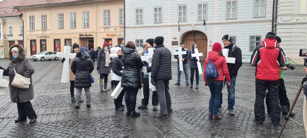 Protest restrâns în centrul Sibiului: ”Mai gravă decât sila noastră este posibilitatea de a pierde România europeană”Aproximativ 30 de persoane au participat vineri seară, în fața magazinului Dumbrava, la un protest pro-democrație. Evenimentul a fost organizat în contextul incertitudinii din ultimele zile generat de rezultatul alegerilor din primul tur pentru președintele României și decizia Curții Constituționale -