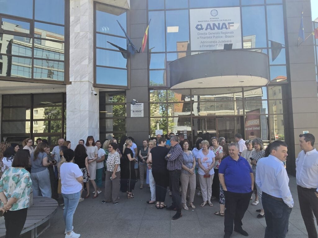 Continuă protestul angajaților ANAF. S-au alăturat marți și cei din Mediaș. Nu vor plafonarea sporului de condiții vătămătoare la 300 de leiAngajații ANAF continuă protestul și marți, după ce luni, aproximativ 50 de persoane au ieșit în fața sediului central din municipiul Sibiu. Astăzi, s-au alăturat protestului și angajații ANAF din Mediaș, anunță conducerea Sindicatului Național Solidaritatea (SNS). Sindicatul a precizat -