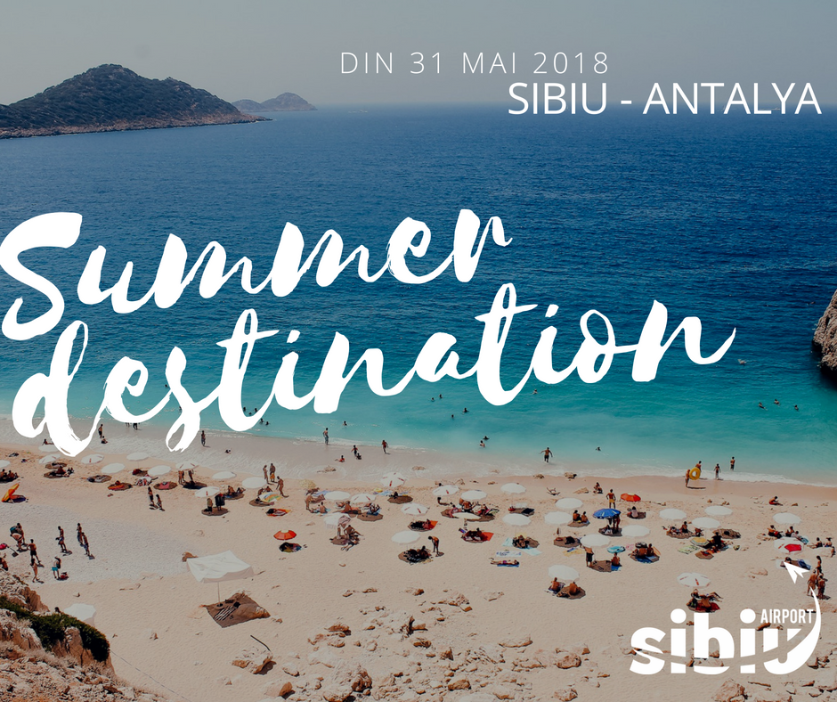 Din 31 mai avem zbor direct din Sibiu la mare, în TurciaÎncepând cu 31 mai 2018, pe Aeroportul Internațional Sibiu se va relua operarea charterului de vacanță Sibiu – Antalya – Sibiu, de către compania aeriană Air Bucharest. Astfel, în perioada 31 mai – 24 septembrie 2018, vor fi operate zboruri -